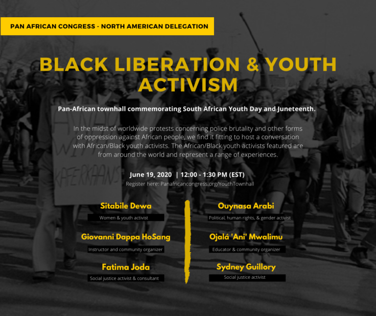 This year South African Youth Day and Juneteeth occur during the same week. In the midst of worldwide protests concerning police brutality and other forms of oppression against African people, we find it fitting to host a conversation with African/Black youth activists. We’re hoping these conversations are useful for coalition building and as we move closer to global liberation through the enactment of Pan Africanism. The African/Black youth activists featured are from around the world and represent a range of experiences.